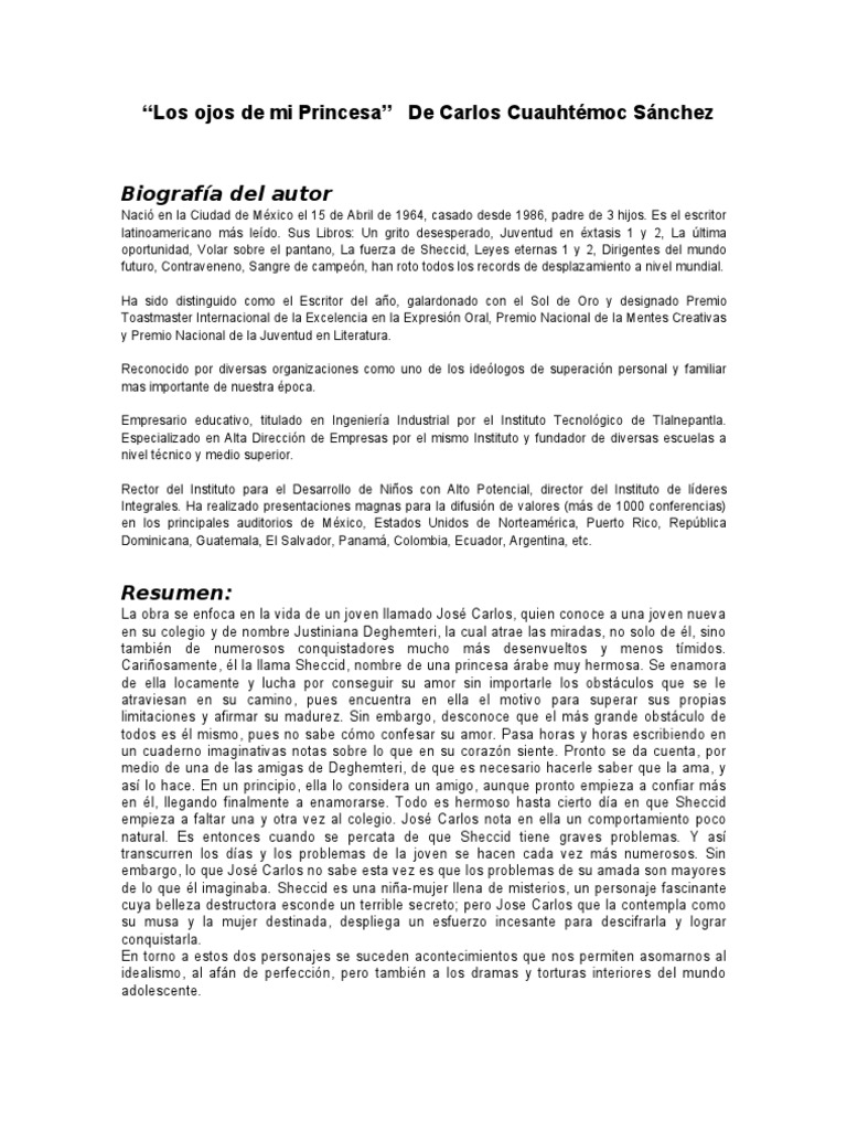 RESUMEN LOS OJOS DE MI PRINCESA 2 POR CAPITULOS Author. LOS OJOS DE MI PRINCESA 2 CARLOS CUAUHTMOC SNCHEZ. Ensayo Ojos De Mi Princesa.