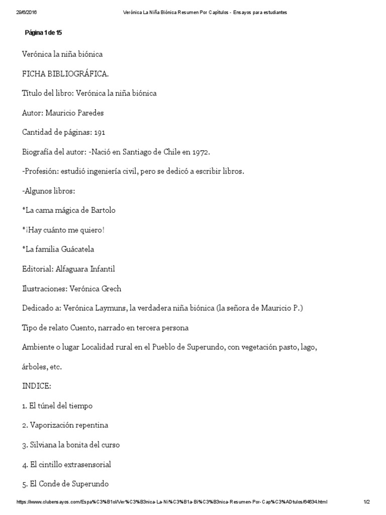 Haz clic aqu para obtener una respuesta a tu pregunta resumen por capitulo del libro veronica la nia bionica nanjari nanjari 02102016 Castellano Bachillerato contestada Resumen por capitulo del libro veronica la nia bionica 2 Ver respuestas Publicidad Publicidad tthy. 3634 palabras 15 pginas. Binica por ser una superherona.